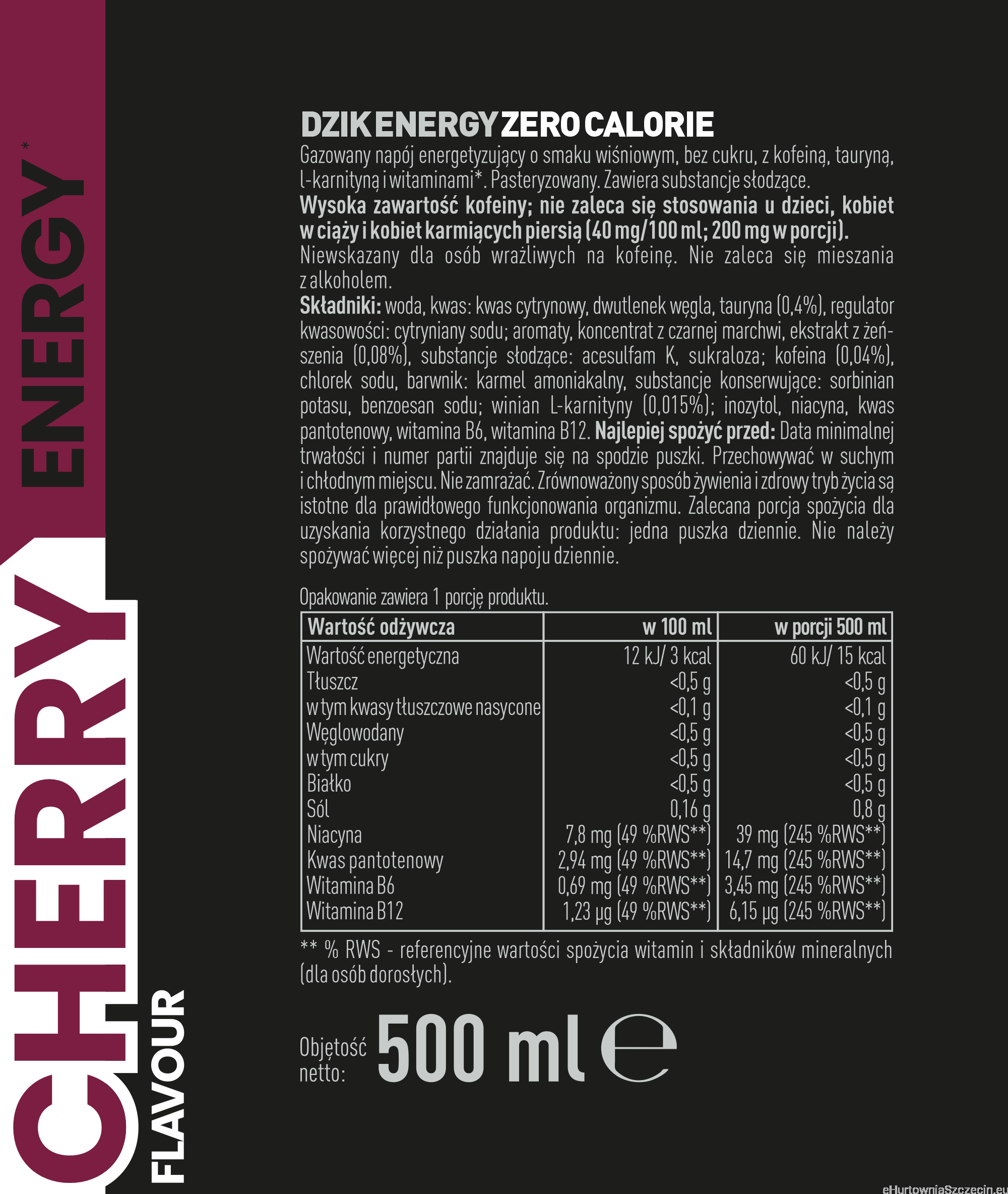 WK DZIK ENERGY jest gazowanym napojem energetycznym bez dodatku cukru, który wyróżnia się wysoką zawartością kofeiny - DZIK ENERGY dostarcza aż 40 mg w 100 ml, zatem zawartość kofeiny w całej puszcze napoju to aż 200 mg! Energetyk firmy WK został wzbogacony także o taurynę, l-karnitynę, guaranę i dawkę witamin: B2, B3, B6, B12. DZIK ENERGY to napój "zero" - nie zawiera dodatku cukru, co czyni go produktem niskokalorycznym, szczególnie polecanym osobom aktywnym, przykładającym uwagę do ilości spożywanych kalorii. Cała puszka napoju od WK to tylko 15 kcal! Dodatkowo, wysoka zawartość kofeiny sprawia, że WK DZIK jest świetnym zamiennikiem przedtreningówki.